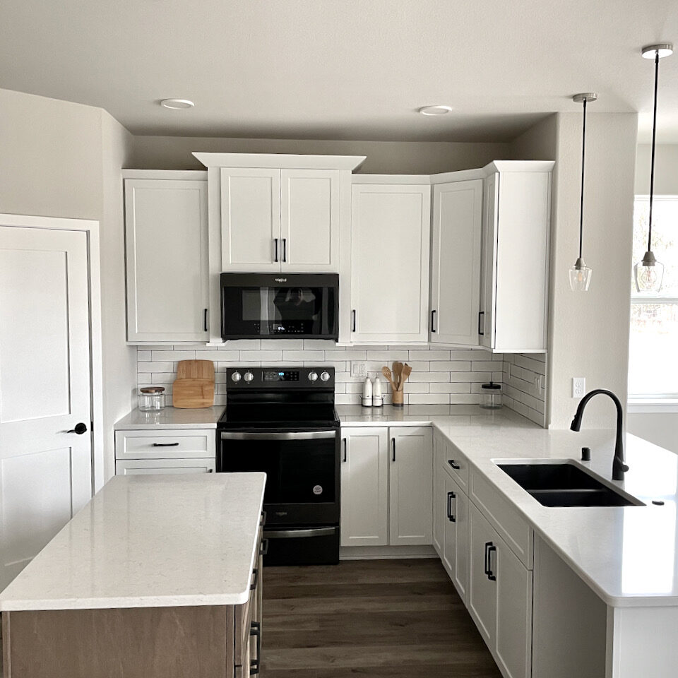 - Soft white painted cabinets and millwork with stained accents